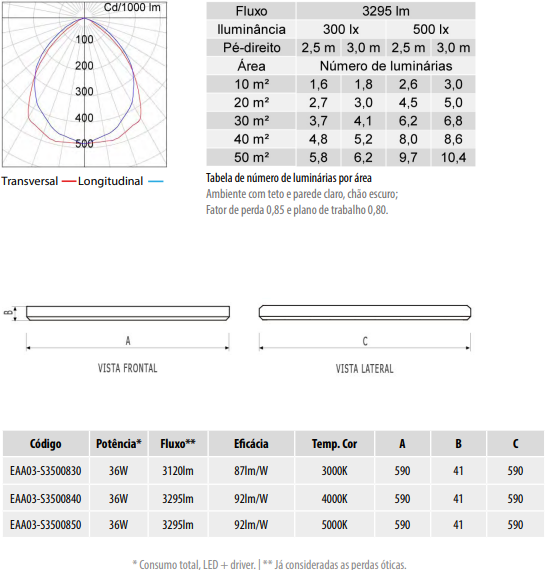 Luminária a LED de sobrepor, com corpo em chapa de aço fosfatizada pintada na cor branca microtexturizada, refletores e aletas em alumínio alto brilho, combinados com difusores recuados em acrílico translúcido. Ideal para ambientes com maior controle de ofuscamento, como escritórios, bancos e outros ambientes corporativos. Completa, com placa de LED e driver multitensão (100-250V) integrados à luminária. Manutenção de no mínimo 70% do fluxo inicial (L70) em 50.000h de uso. IP20. IRC>80.