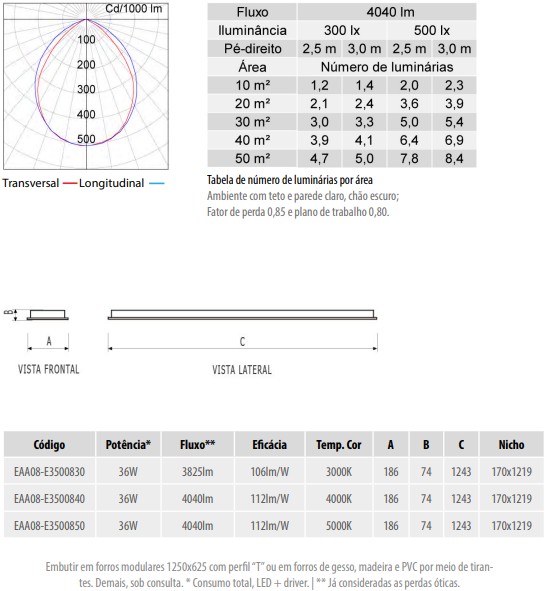 Luminária a LED de embutir, com corpo em chapa de aço fosfatizada pintada na cor branca microtexturizada, refletores e aletas parabólicos em alumínio alto brilho. alumínio alto brilho, combinados com difusores empolicarbonato texturizado. Ideal para ambientes com maior controle de ofuscamento, como escritórios, bancos e outros ambientes corporativos. Completa, com placa de LED e driver multitensão (100-250V) integrados à luminária. Manutenção de no mínimo 70% do fluxo inicial (L70) em 50.000h de uso. IP20. IRC>80.